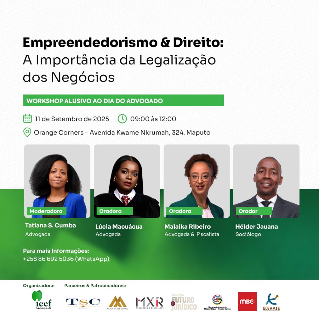 A ICEF vai realizar, no próximo dia 11 de Setembro, na Orange Corners, um workshop alusivo ao Dia do Advogado, sob o tema “Empreendedorismo & Direito: a importância da legalização dos negócios” – um evento que visa destacar a relevância da formalização jurídica dos negócios, capacitando, através dos debates, empreendedores e demais profissionais a compreenderem a importância de regularizar empreendimentos. Ademais, o workshop representa uma oportunidade singular para que os empresários, de diversos ramos de actuação, esclareçam dúvidas e façam networking.