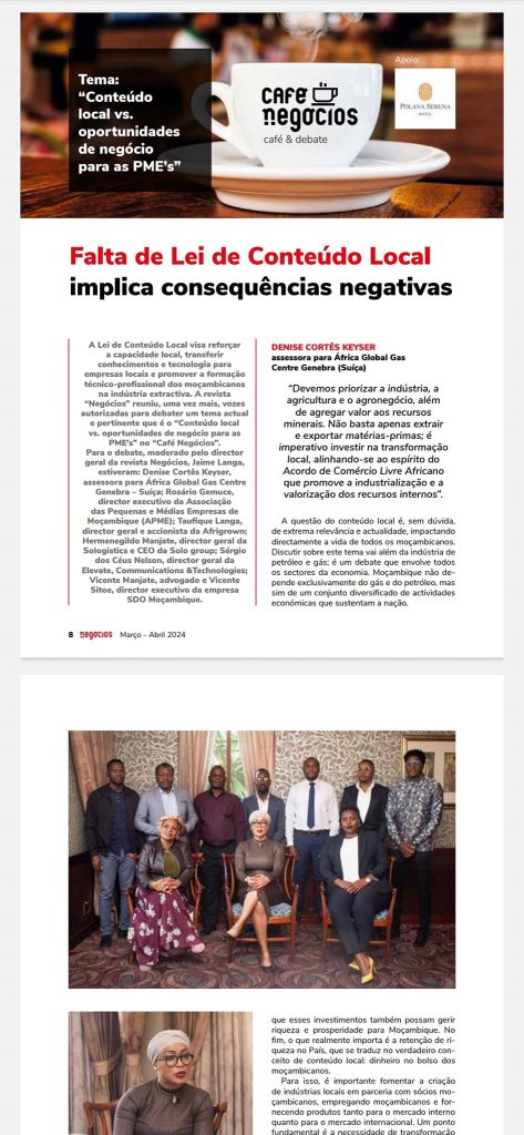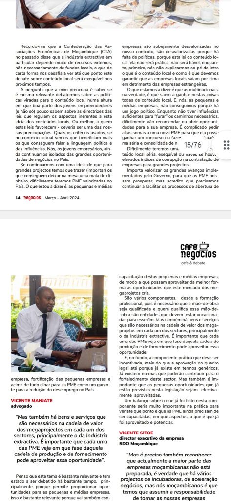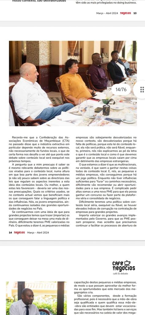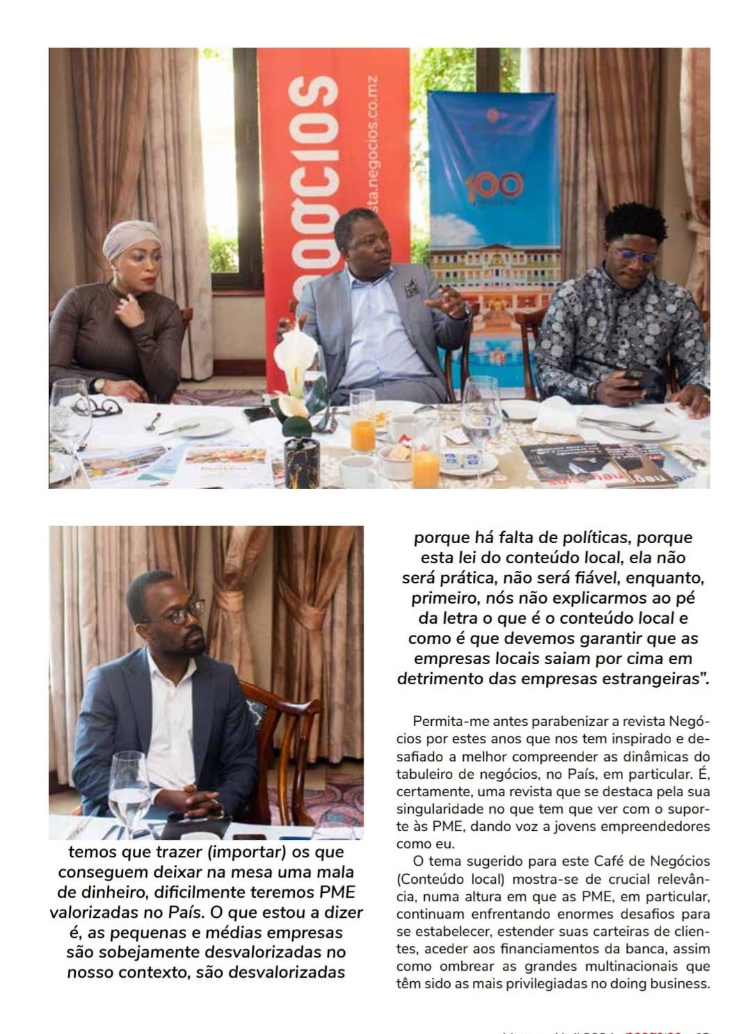 A convite do Director da Revista Negócios, Jaime Langa, Sérgio dos Céus Nelson participou de debate contextualizado no “Café Negócios”. Na edição de Março – Abril, da revista, de 2024, é possível ler sua opinião sobre a ideia do conteúdo local e uma análise da lei que espera criar oportunidades para as PME’S, em particular.